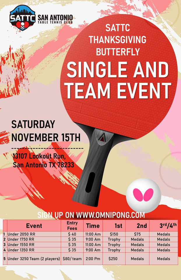 USATT THANKSGIVING BUTTERFLY Single & Team Event NOVEMBER 15th